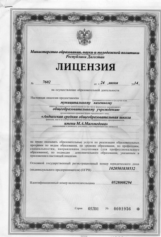 | Полное наименование образовательной организации* | Муниципальное казенное общеобразовательное учреждение "Андыхская средняя общеобразовательная школа им.М.А.Магомедова" |